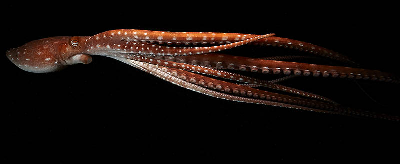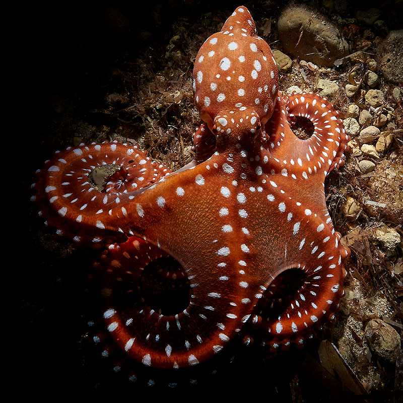 Callistoctopus macropus, known as the White Spotted Octopus, is a cryptic and understudied species. It's a genus of nocturnal, red octopuses in the family Octopodidae.