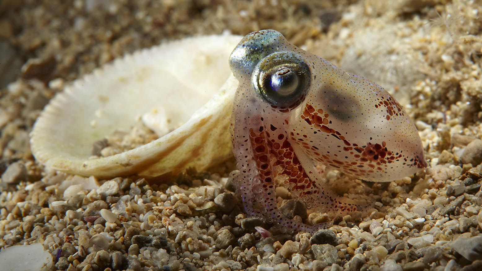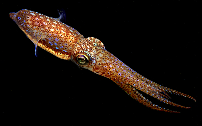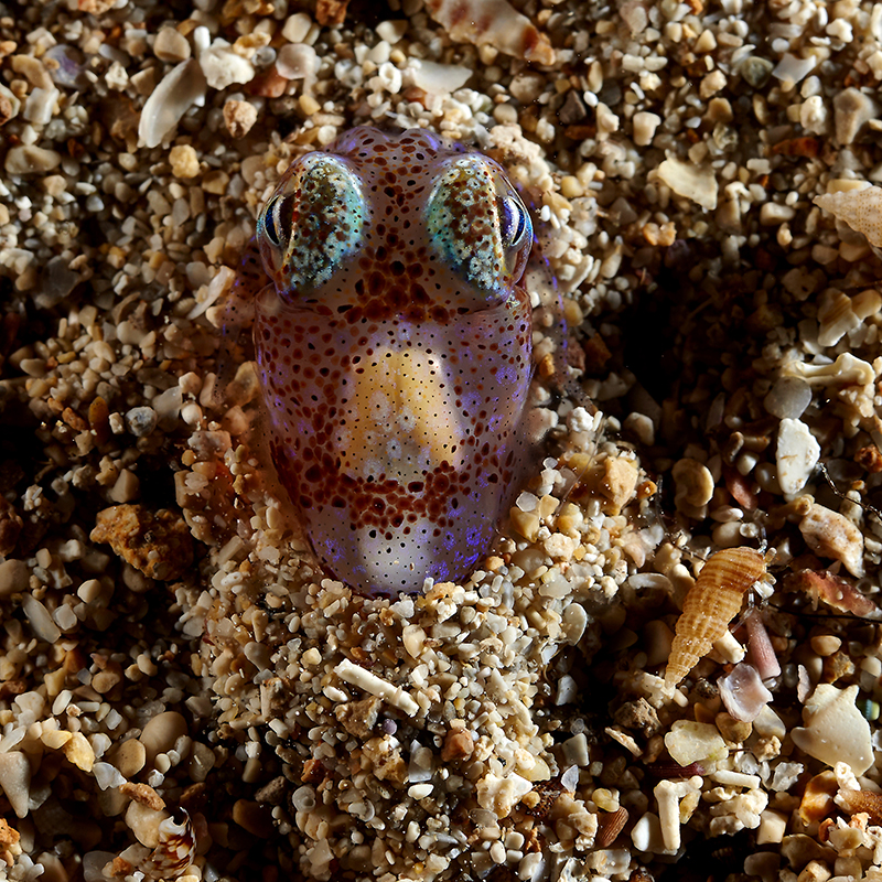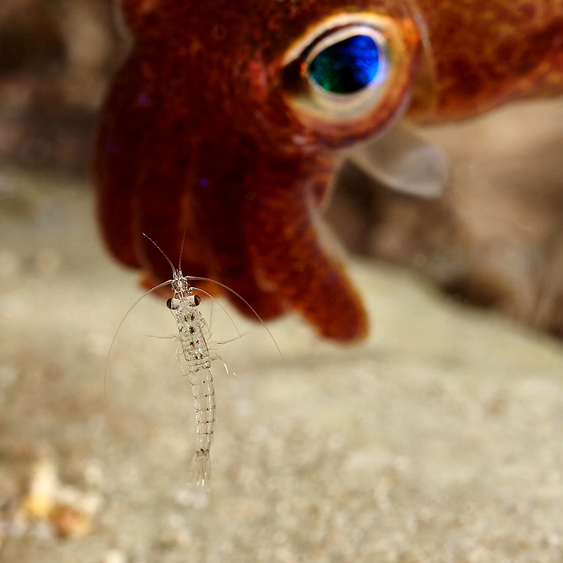 Bobtail squid are nocturnal and feed on small prey on small molluscs, crustaceans, shrimp and small fish.