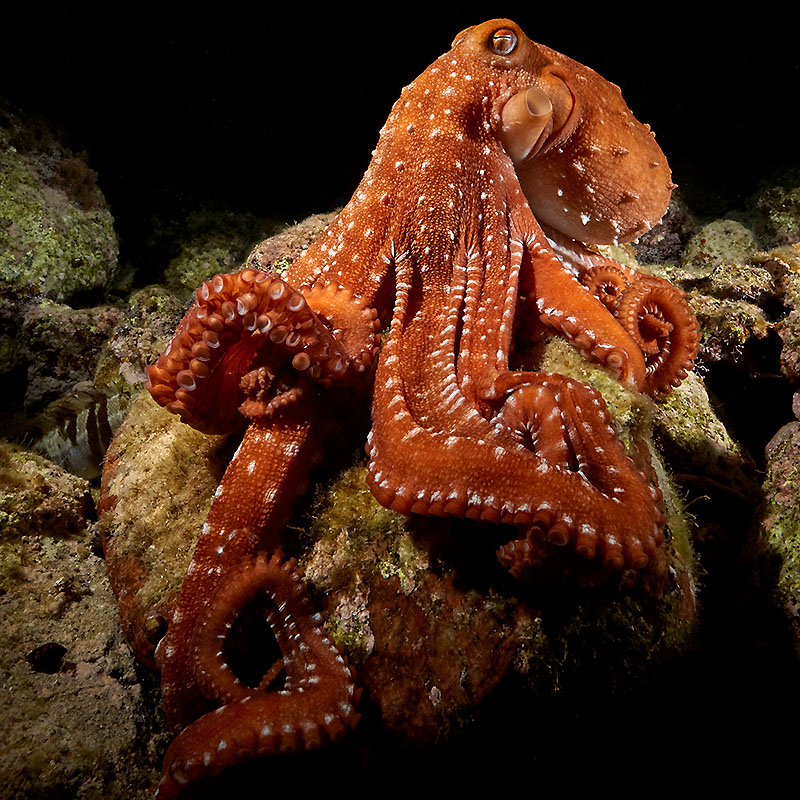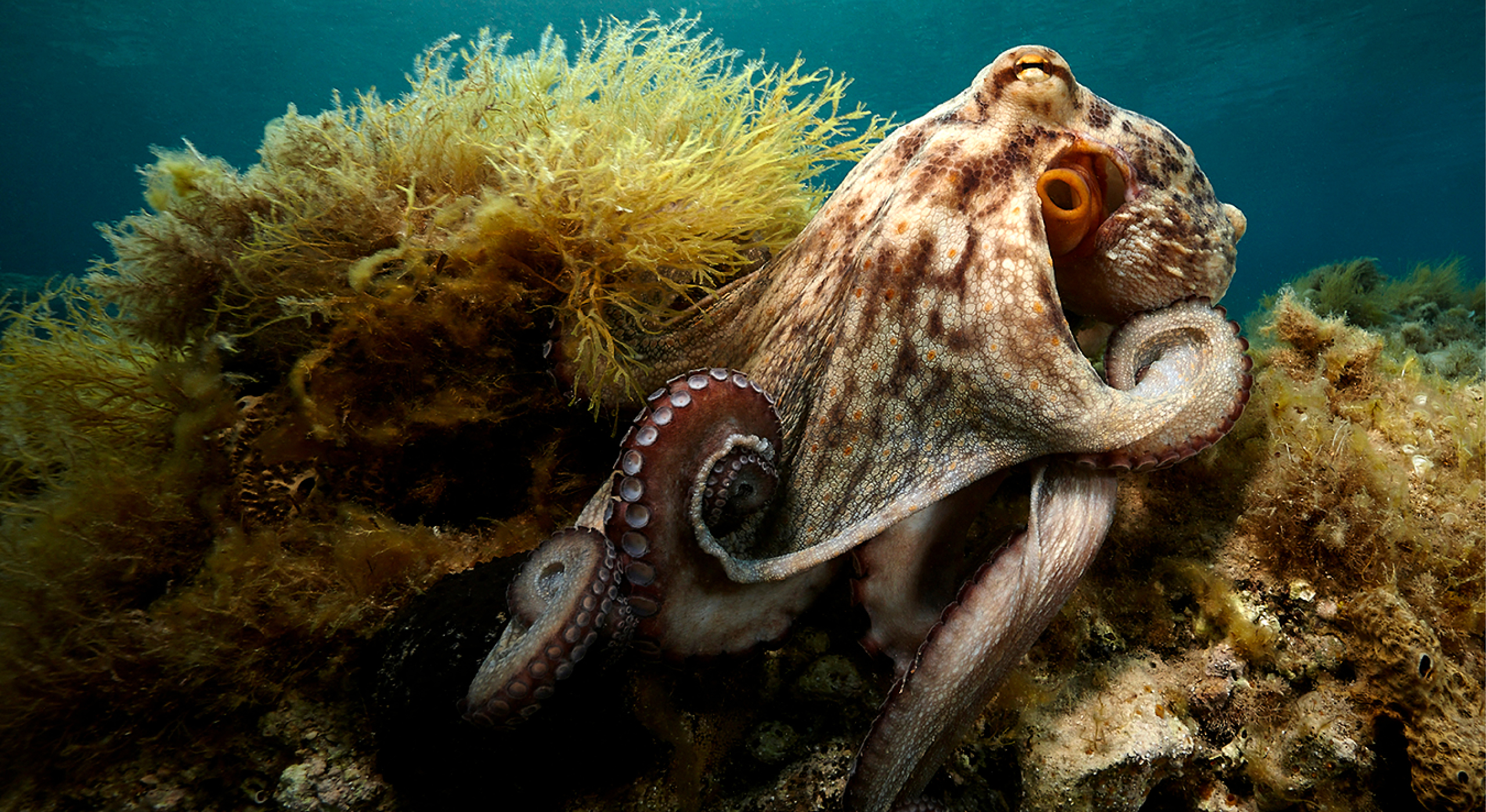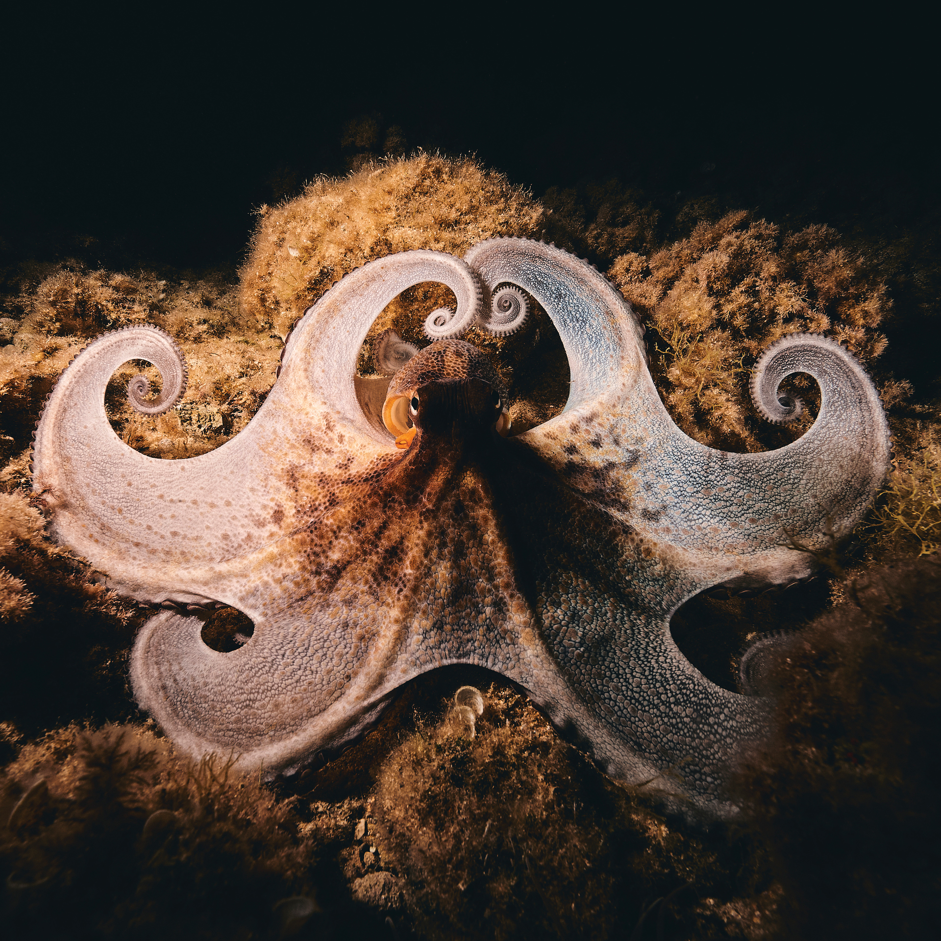 Instantly recognisable by its bulbous head, sinuous arms, and large, expressive eyes, the common octopus stands out for its appearance and remarkable intelligence. Boasting the most significant brain-to-body ratio among all invertebrates, these creatures demonstrate an extraordinary capacity for learning and problem-solving.