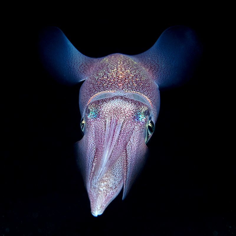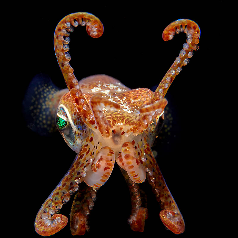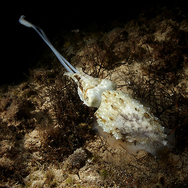 The Dwarf Bobtail Squid ( Sepiola rondeletii ) is native to the northeastern Atlantic and Mediterranean Sea. It has eight suckered arms and two tentacles. It is a small cephalopod: females grow to max. 60 mm in mantle length (though usually from 40 to 50 mm), while males do not grow larger than 25 mm. The weight is between 0.1- 1.4 grams in mass. It has a rounder mantle than cuttlefish and has no cuttlebone. It can swim using two fins on its mantle or jet propulsion. Its eyes are huge compared to its body, making it look super cute.
